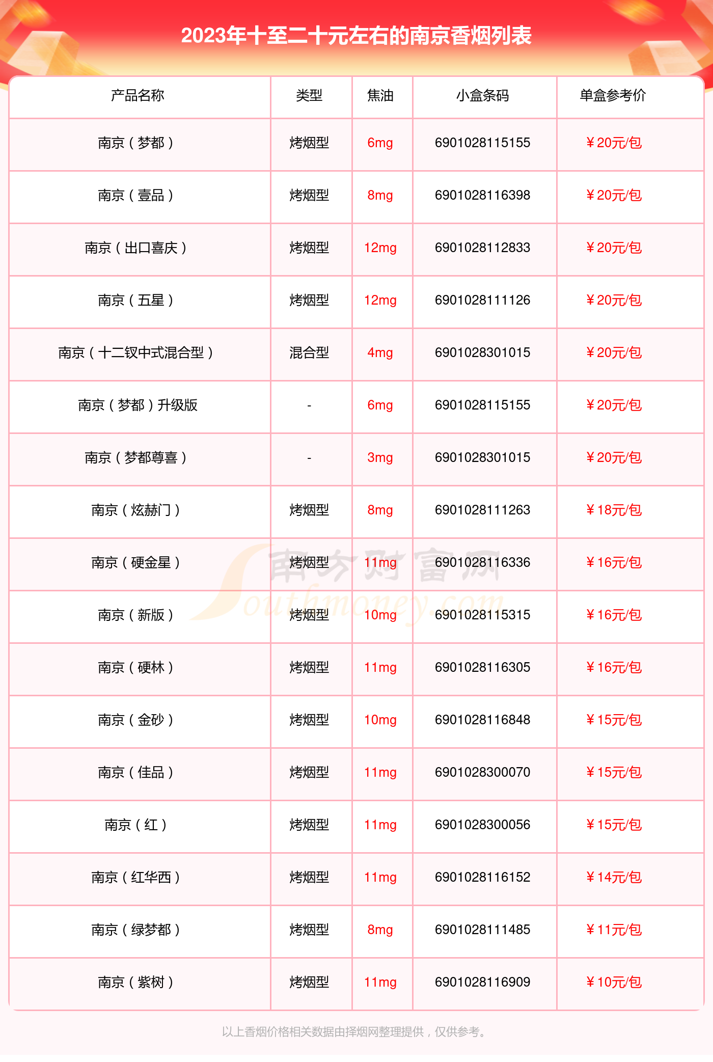 南京香烟十至二十元左右的烟分别有南京(梦都)参考价20.0元/包、南京(壹品)参考价20.0元/包、南京(出口喜庆)参考价20.0元/包、南京(五星)参考价20.0元/包、南京(十二钗中式混合型)参考价20元/包、南京(梦都)升级版参考价20元/包、南京(梦都尊喜)参考价20元/包、南京(炫赫门)参考价18.0元/包、南京(硬金星)参考价16.0元/包、南京(新版)参考价16.0元/包等。
