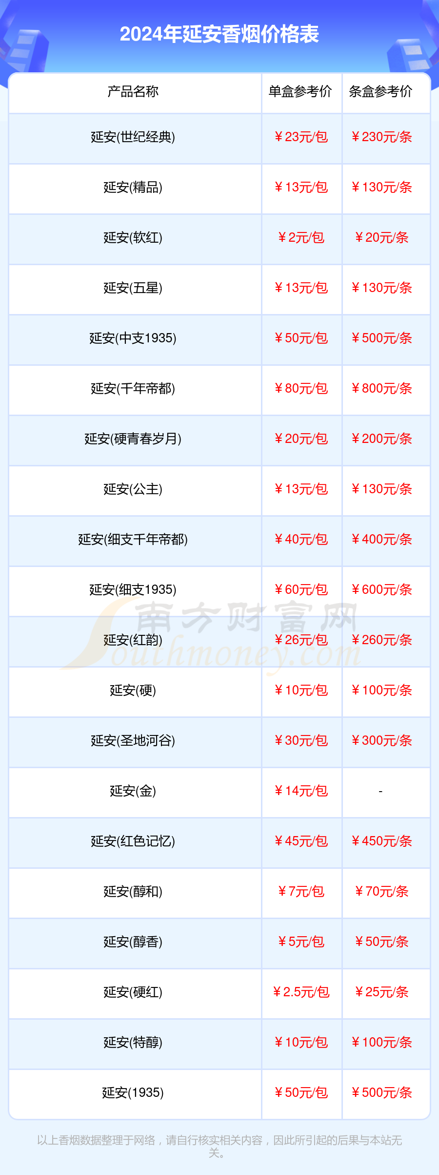 2024年延安香烟延安(千年帝都)、延安(细支1935)、延安(中支1935)、延安(1935)、延安(红色记忆)、延安(细支千年帝都)等最新价格如下:延安(千年帝都)参考价80.0元/包、延安(细支1935)参考价60.0元/包、延安(中支1935)参考价50.0元/包、延安(1935)参考价50.0元/包、延安(红色记忆)参考价45.0元/包、延安(细支千年帝都)参考价40.0元/包。