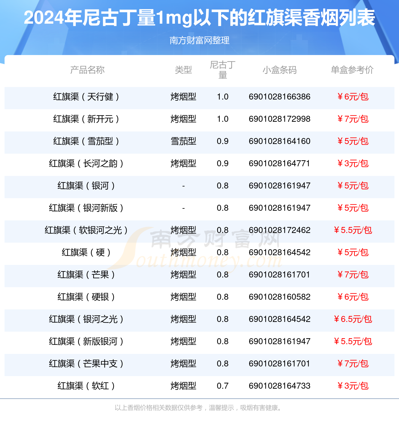 择烟网为大家盘点了红旗渠香烟尼古丁量1mg以下的,分别有红旗渠(天行健)、红旗渠(新开元)、红旗渠(雪茄型)、红旗渠(长河之韵)、红旗渠(银河)、红旗渠(银河新版)、红旗渠(软银河之光)、红旗渠(硬)、红旗渠(芒果)、红旗渠(硬银)等,详细价格如下: