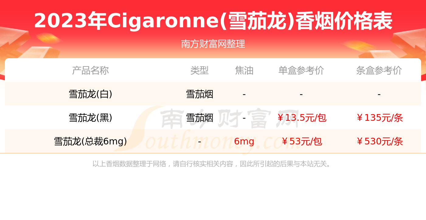 2023年Cigaronne(雪茄龙)香烟雪茄龙(总裁6mg)、雪茄龙(黑)等最新价格如下: