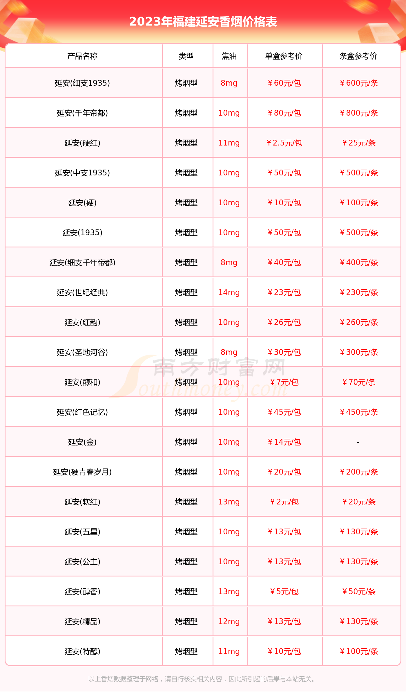 2023年福建延安香烟延安(千年帝都)、延安(细支1935)、延安(中支1935)等最新价格如下: