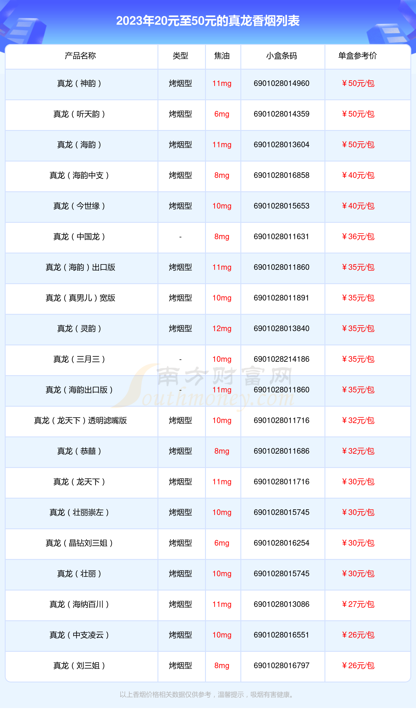 真龙(神韵)参考价50.0元/包、真龙(听天韵)参考价50.0元/包、真龙(海韵)参考价50.0元/包、真龙(海韵中支)参考价40.0元/包、真龙(今世缘)参考价40元/包、真龙(中国龙)参考价36.0元/包、真龙(海韵)出口版参考价35.0元/包、真龙(真男儿)宽版参考价35.0元/包、真龙(灵韵)参考价35.0元/包、真龙(三月三)参考价35元/包等。