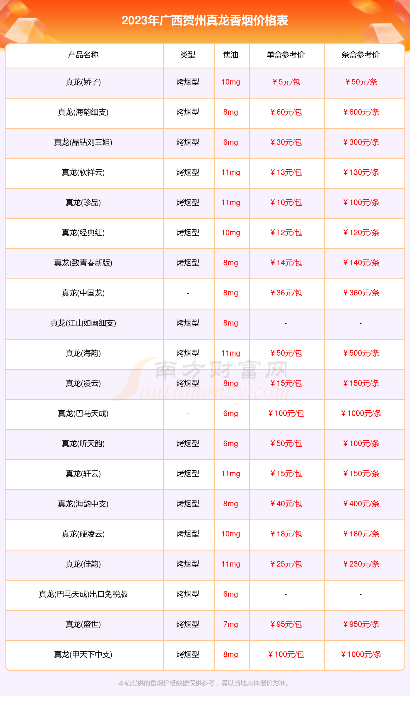 广西贺州真龙香烟价格最高的是真龙(巴马天成),参考价1000.0元/条,最低的是真龙(娇子),参考价50.0元/条,价格高低差为950元/条。