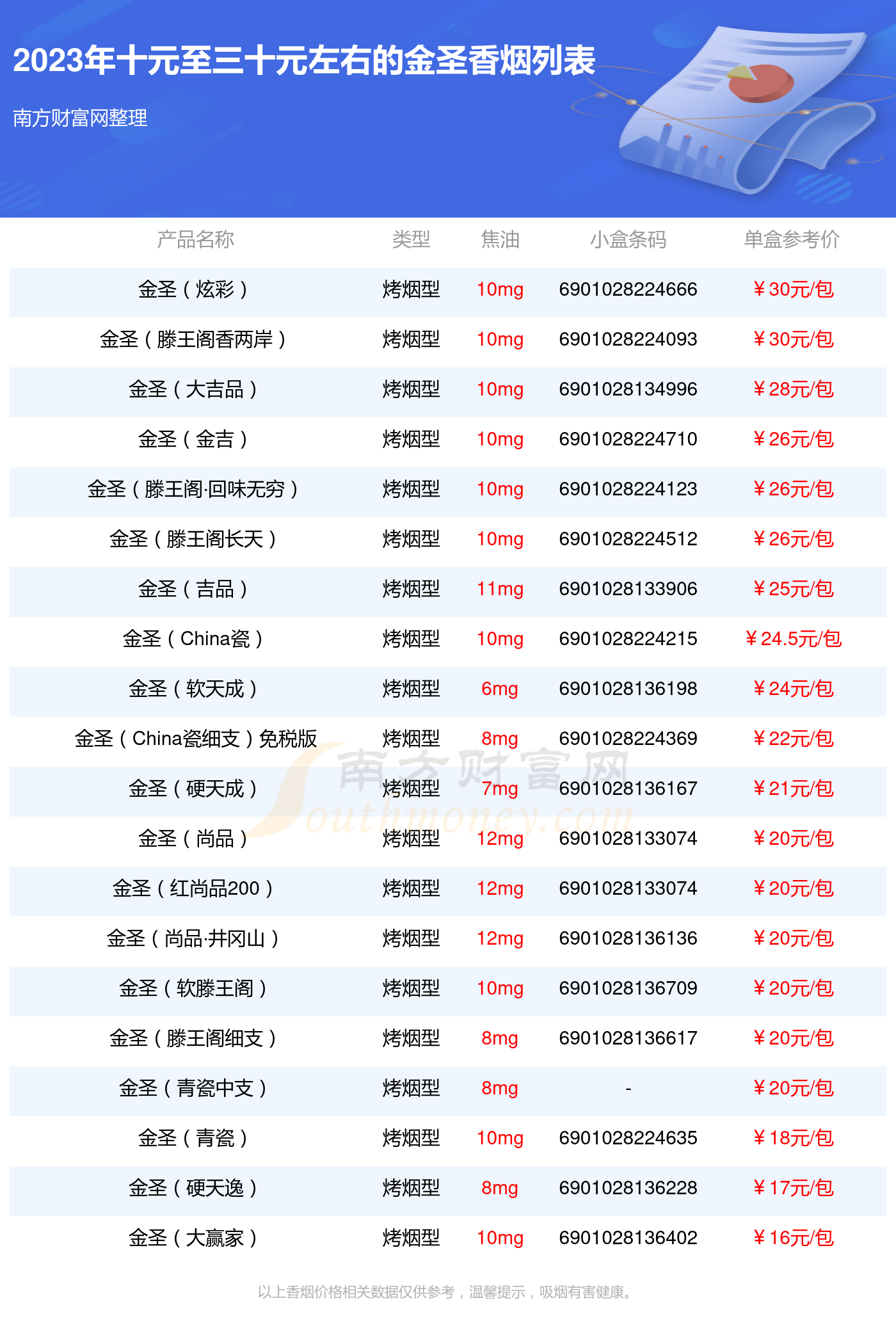 金圣香烟十元至三十元左右的烟分别有金圣(炫彩)参考价30.0元/包、金圣(滕王阁香两岸)参考价30.0元/包、金圣(大吉品)参考价28.0元/包、金圣(金吉)参考价26.0元/包、金圣(滕王阁·回味无穷)参考价26元/包、金圣(滕王阁长天)参考价26元/包、金圣(吉品)参考价25.0元/包、金圣(China瓷)参考价24.5元/包、金圣(软天成)参考价24.0元/包、金圣(China瓷细支)免税版参考价22.0元/包等。