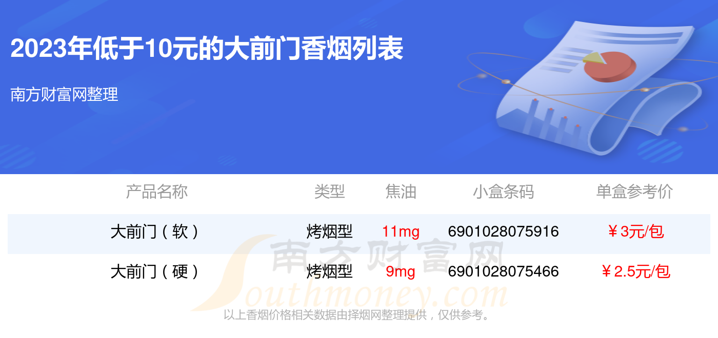 大前门(软)参考价3元/包、大前门(硬)参考价2.5元/包等。