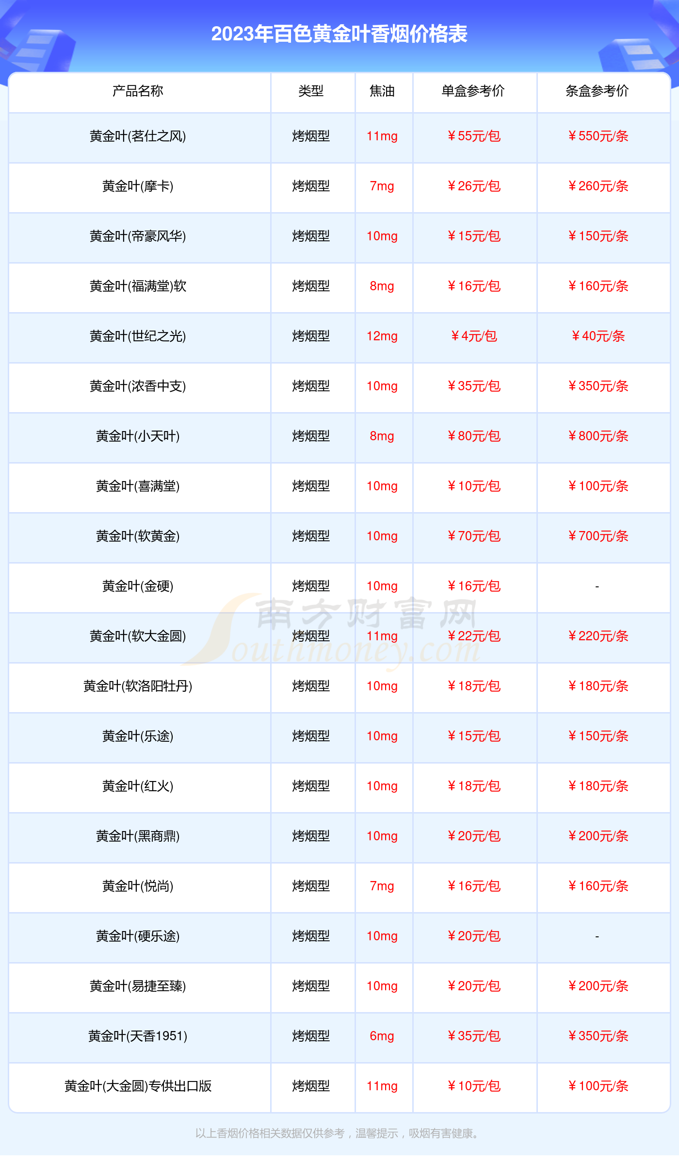 黄金叶(天叶中支)参考价1200.0元/条、黄金叶(天叶细支)参考价1000.0元/条、黄金叶(天叶)参考价1000.0元/条、黄金叶(小天叶)参考价800.0元/条、黄金叶(小天叶红旗渠)参考价800.0元/条、黄金叶(软黄金)参考价700.0元/条、黄金叶(天尊)参考价700.0元/条。