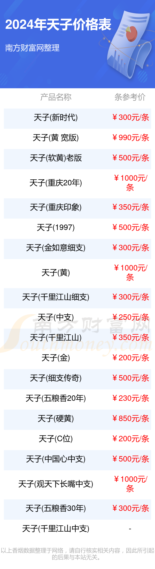 2024天子香烟最新价格:天子(黄)参考价1000.0元/包、天子(重庆20年)参考价100.0元/包、天子(观天下长嘴中支)参考价100.0元/包、天子(千里江山中支)参考价100.0元/包、天子(传奇)参考价100.0元/包。
