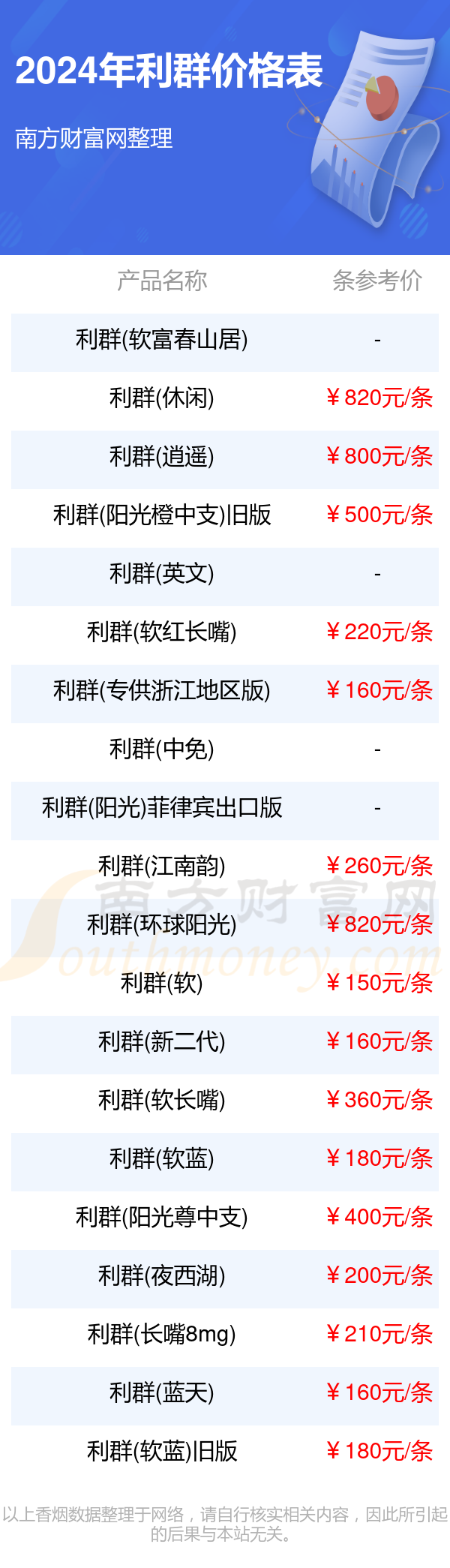 利群(休闲细支)参考价1000.0元/条、利群(休闲云端)参考价1000.0元/条、利群(红利)参考价1000.0元/条、利群(休闲)参考价820.0元/条、利群(环球阳光)参考价820.0元/条、利群(逍遥)新参考价820.0元/条、利群(逍遥)参考价800.0元/条、利群(天外天)参考价650.0元/条。