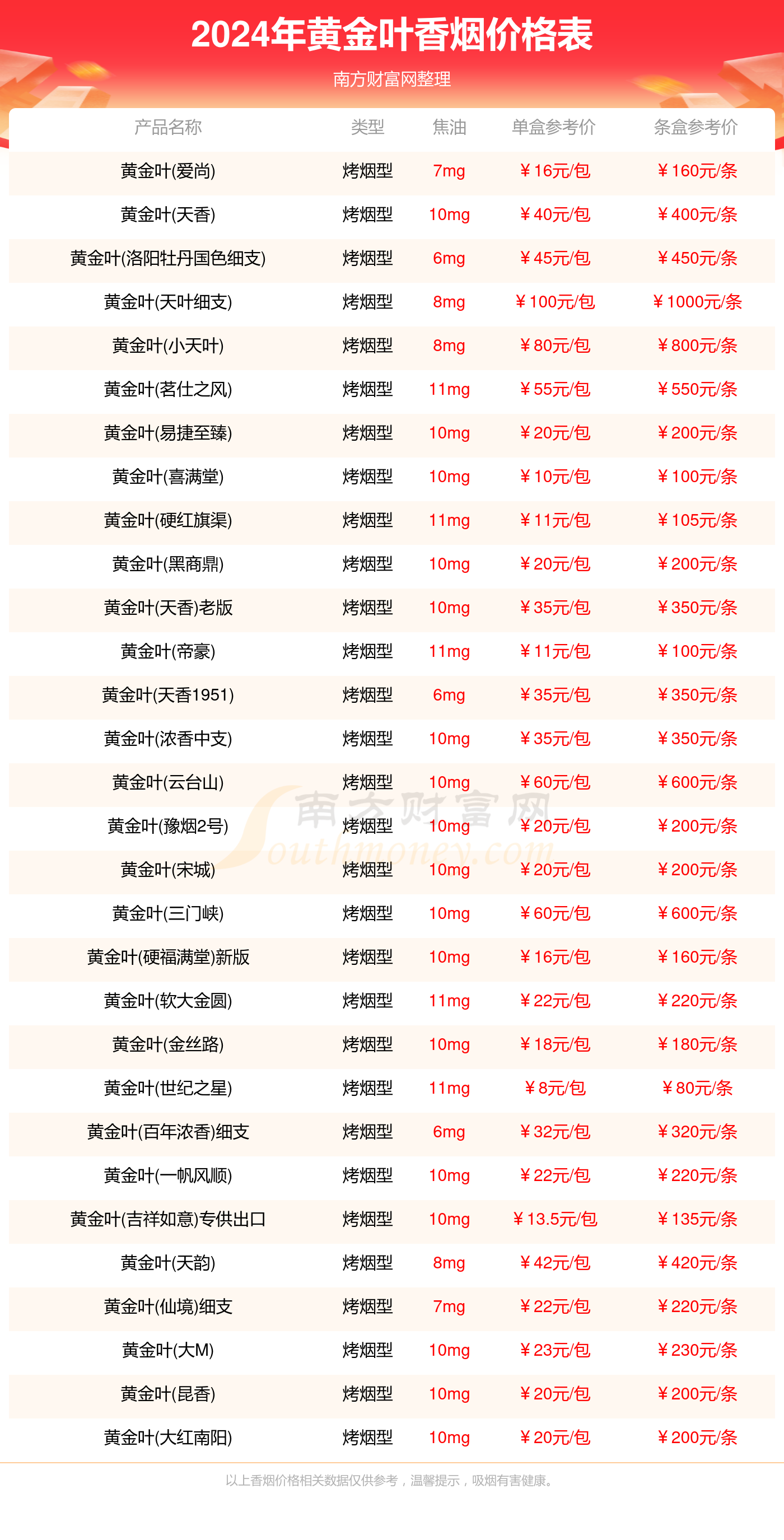 2024黄金叶香烟最新价格:黄金叶(天叶中支)参考价120.0元/包、黄金叶(天叶细支)参考价100.0元/包、黄金叶(天叶)参考价100.0元/包、黄金叶(小天叶)参考价80.0元/包。
