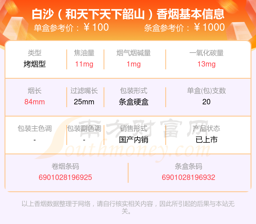 白沙香烟80元到100元的烟有白沙(硬和天下双中支)、白沙(软和天下檀香)、白沙(和天下尊品中支)、白沙(软和天下)、白沙(细支和天下)、白沙(和天下)、白沙(和天下尊品中支)、白沙(和天下天下韶山)、白沙(和天下尊享84mm)、白沙(和天下尊享)等,详细价格如下: