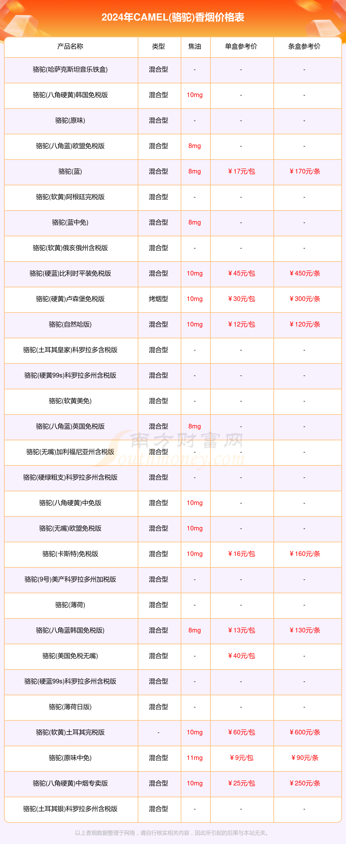 骆驼(软黄)土耳其完税版参考价600.0元/条、骆驼(硬蓝)比利时平装免税版参考价450.0元/条、骆驼(硬黄)卢森堡免税版参考价300.0元/条、骆驼(八角硬黄)中烟专卖版参考价250.0元/条、骆驼(蓝)参考价170.0元/条、骆驼(卡斯特)免税版参考价160.0元/条、骆驼(八角蓝韩国免税版)参考价130.0元/条。