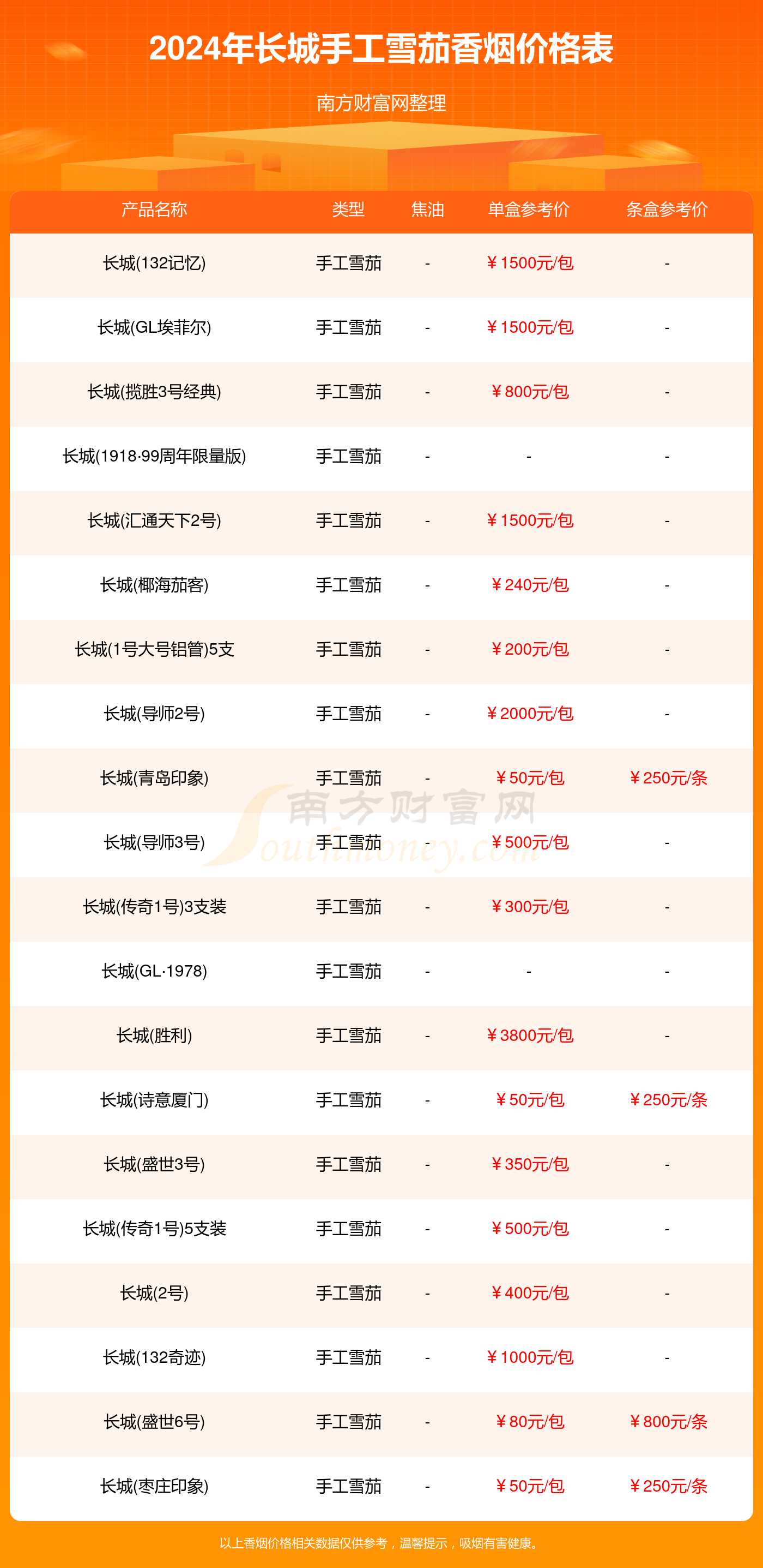 长城(胜利)参考价3800.0元/包、长城(导师2号)参考价2000.0元/包、长城(GL埃菲尔)参考价1500.0元/包、长城(生肖版)参考价1500.0元/包、长城(132记忆)参考价1500.0元/包。