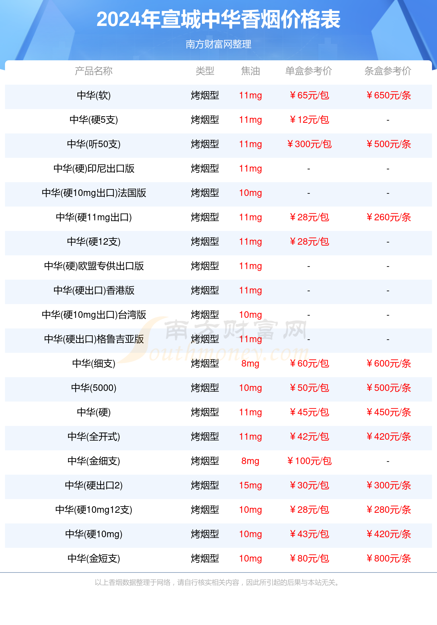 2024宣城中华香烟最新价格:中华(听50支)参考价300.0元/包、中华(大中华)参考价100.0元/包、中华(金中支)参考价100.0元/包、中华(金细支)参考价100.0元/包、中华(金短支)参考价80.0元/包、中华(软)参考价65.0元/包、中华(双中支)参考价65.0元/包。