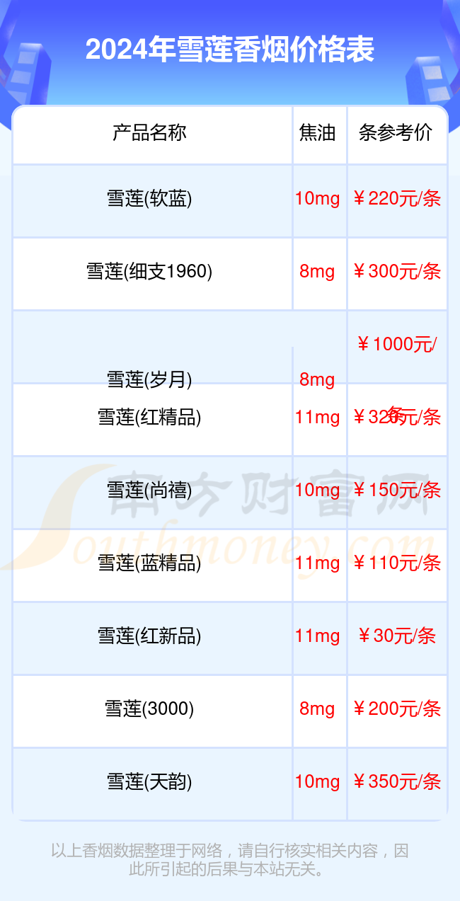 2024年,雪莲(岁月)、雪莲(天韵)、雪莲(红精品)等雪莲香烟价格如下: