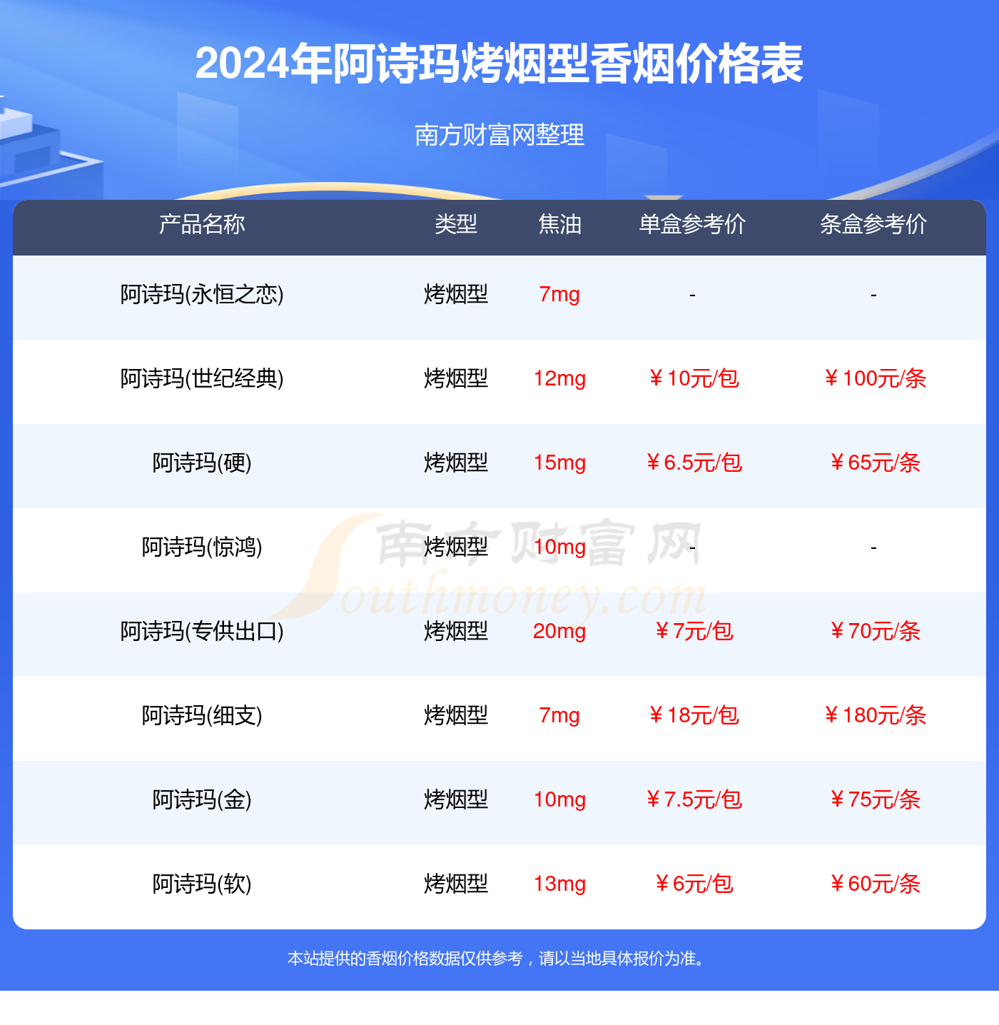 2024年,阿诗玛(细支)、阿诗玛(世纪经典)、阿诗玛(金)、阿诗玛(专供出口)、阿诗玛(硬)、阿诗玛(软)等阿诗玛烤烟型香烟价格如下:阿诗玛(细支)参考价18.0元/包、阿诗玛(世纪经典)参考价10.0元/包、阿诗玛(金)参考价7.5元/包、阿诗玛(专供出口)参考价7.0元/包、阿诗玛(硬)参考价6.5元/包、阿诗玛(软)参考价6.0元/包。