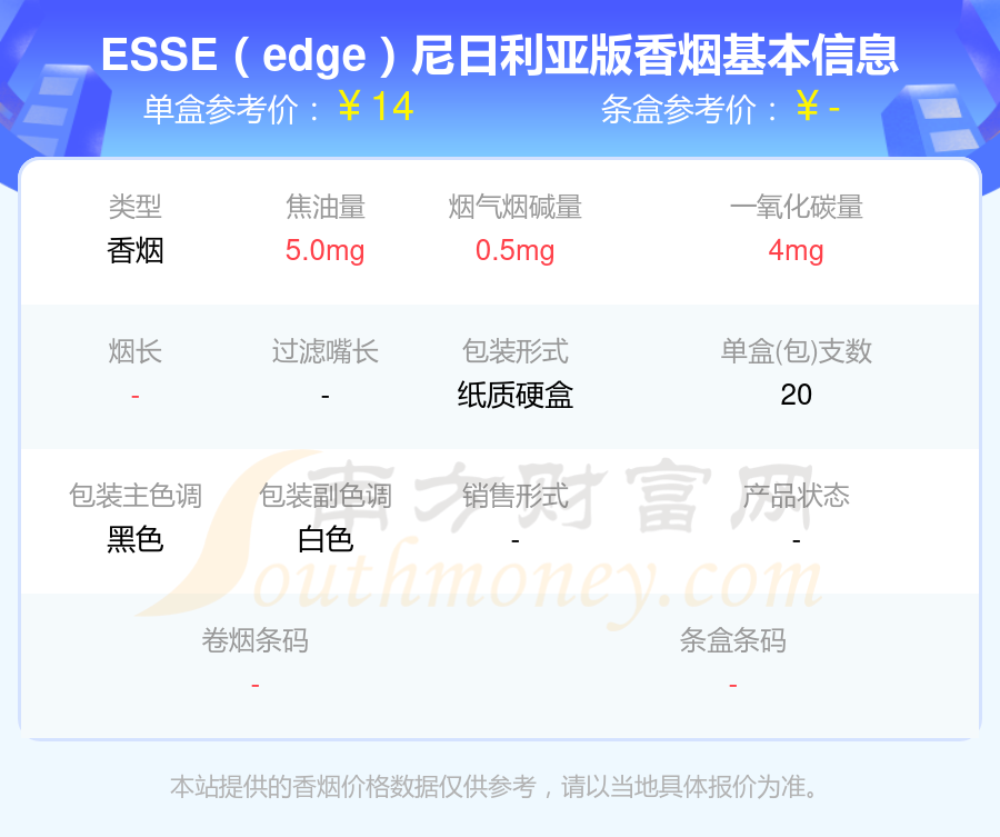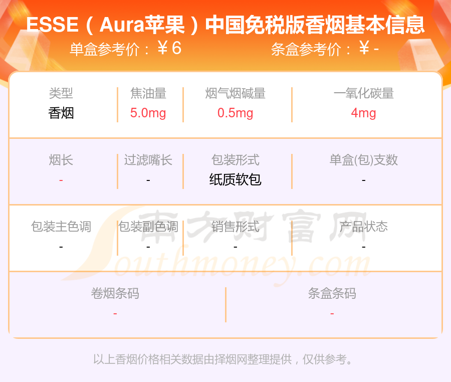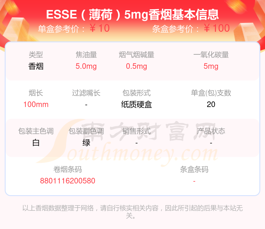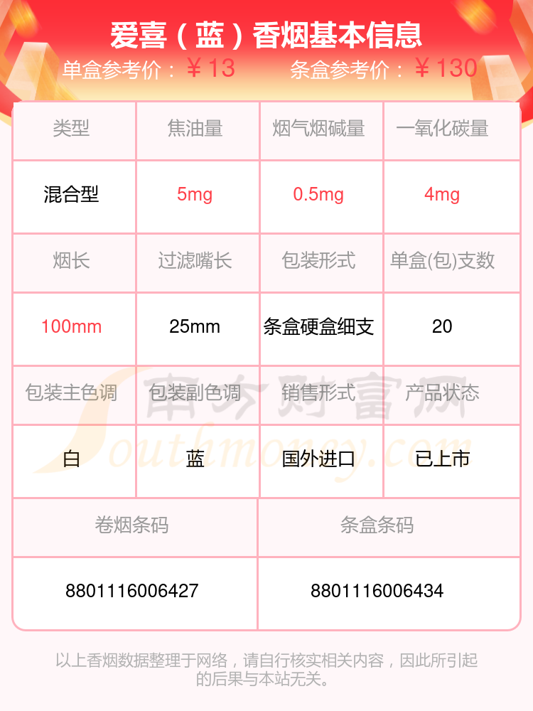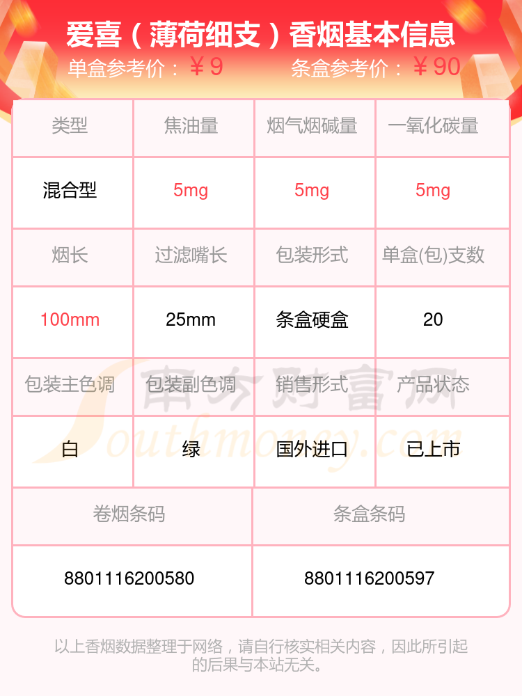 ESSE(爱喜)香烟尼古丁量10mg以下的烟有爱喜(薄荷细支)、爱喜(金)、ESSE(经典)6mg、爱喜(经典)、ESSE(Aura苹果)中国免税版、爱喜(蓝)、ESSE(edge)尼日利亚版、ESSE(薄荷)5mg、爱喜(薄荷)、爱喜(蓝特醇免税韩版)等,详细价格如下: