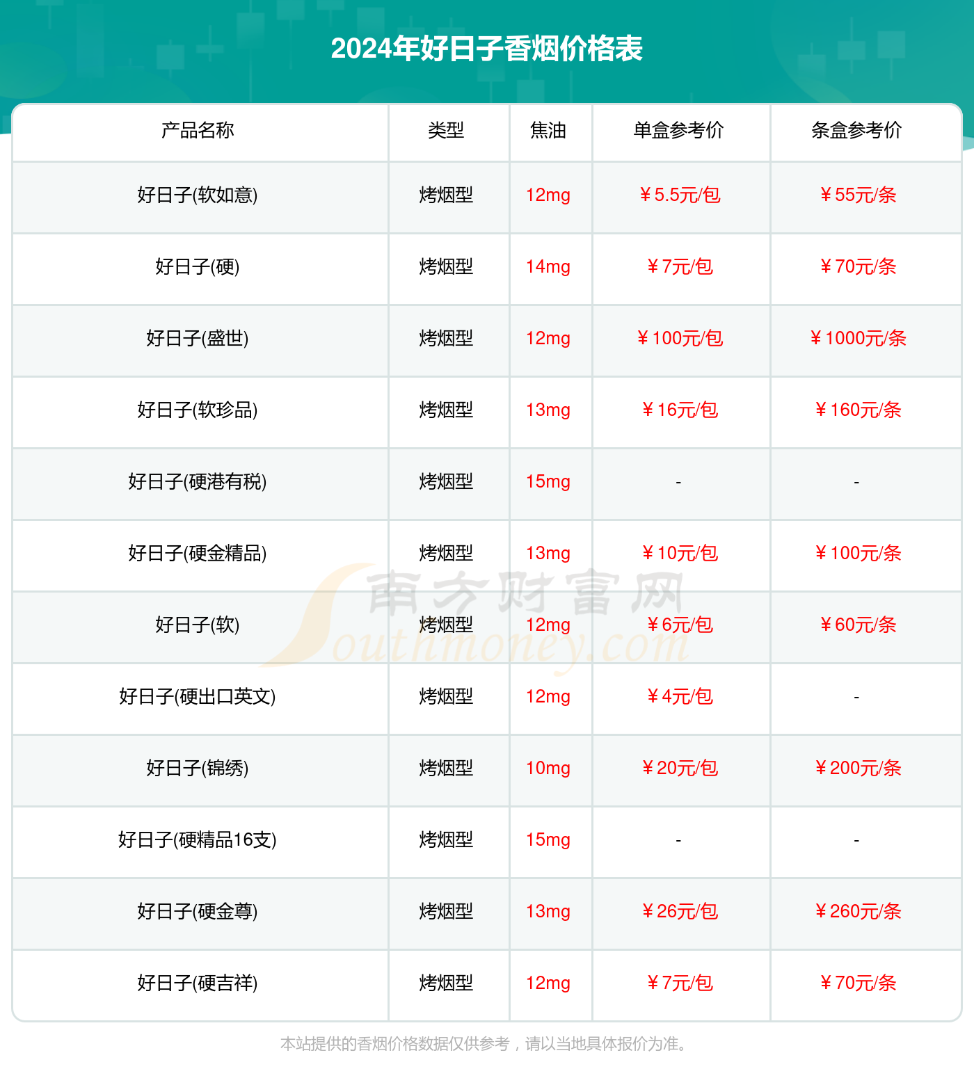 2024年好日子香烟好日子(盛世)、好日子(硬金尊)、好日子(锦绣)、好日子(软珍品)、好日子(硬金精品)、好日子(硬吉祥)、好日子(硬)等最新价格如下:好日子(盛世)参考价100.0元/包、好日子(硬金尊)参考价26.0元/包、好日子(锦绣)参考价20.0元/包、好日子(软珍品)参考价16.0元/包、好日子(硬金精品)参考价10.0元/包、好日子(硬吉祥)参考价7.0元/包、好日子(硬)参考价7.0元/包。