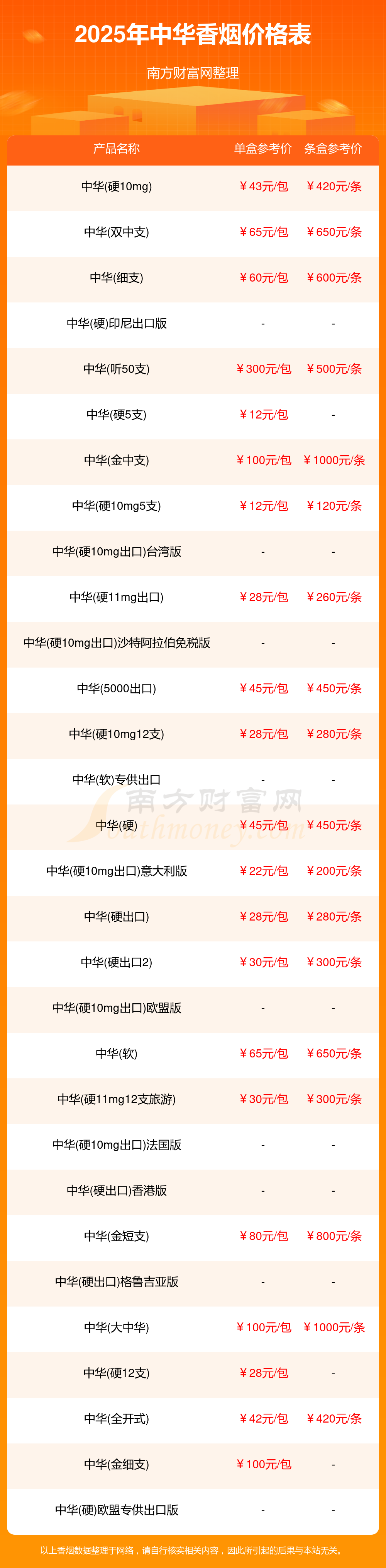以上香烟价格相关数据仅供参考,温馨提示,吸烟有害健康。