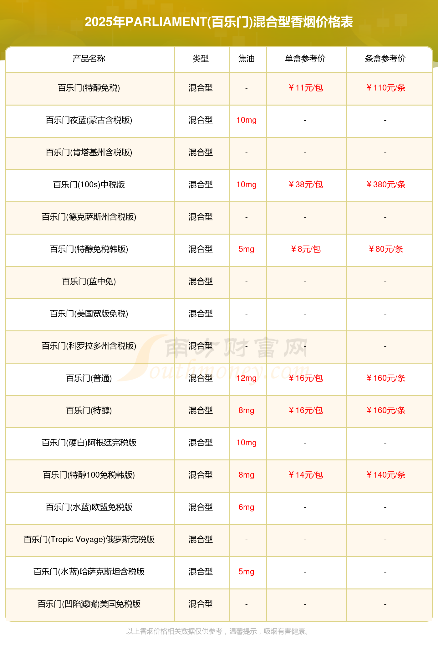 2025PARLIAMENT(百乐门)混合型香烟最新价格:百乐门(100s)中税版参考价38.0元/包、百乐门(特醇)参考价16.0元/包、百乐门(普通)参考价16.0元/包、百乐门(特醇100免税韩版)参考价14.0元/包、百乐门(特醇免税)参考价11.0元/包、百乐门(特醇免税韩版)参考价8.0元/包。