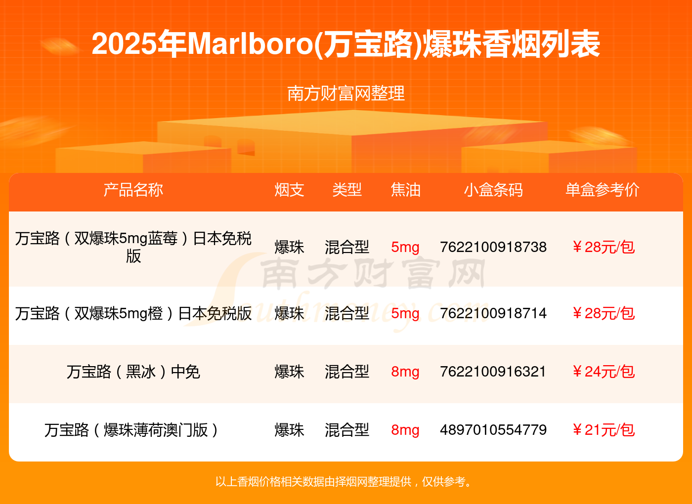 Marlboro(万宝路)香烟爆珠的烟有万宝路(双爆珠5mg蓝莓)日本免税版、万宝路(双爆珠5mg橙)日本免税版、万宝路(黑冰)中免、万宝路(爆珠薄荷澳门版)等,详细价格如下: