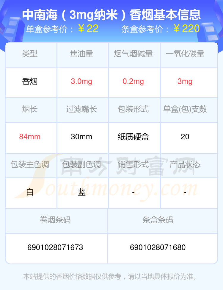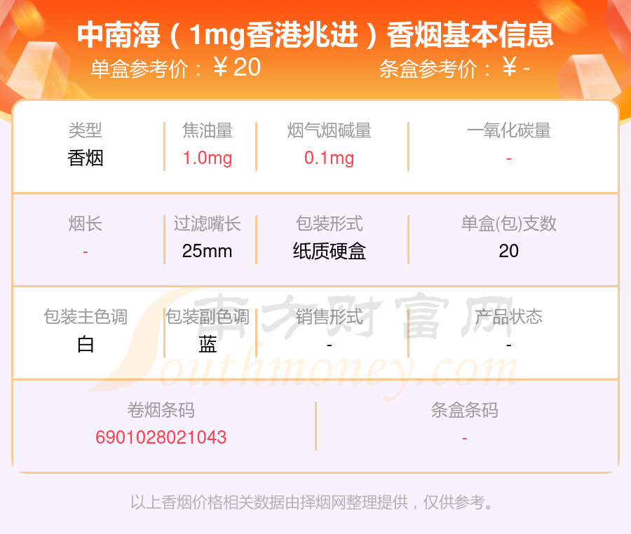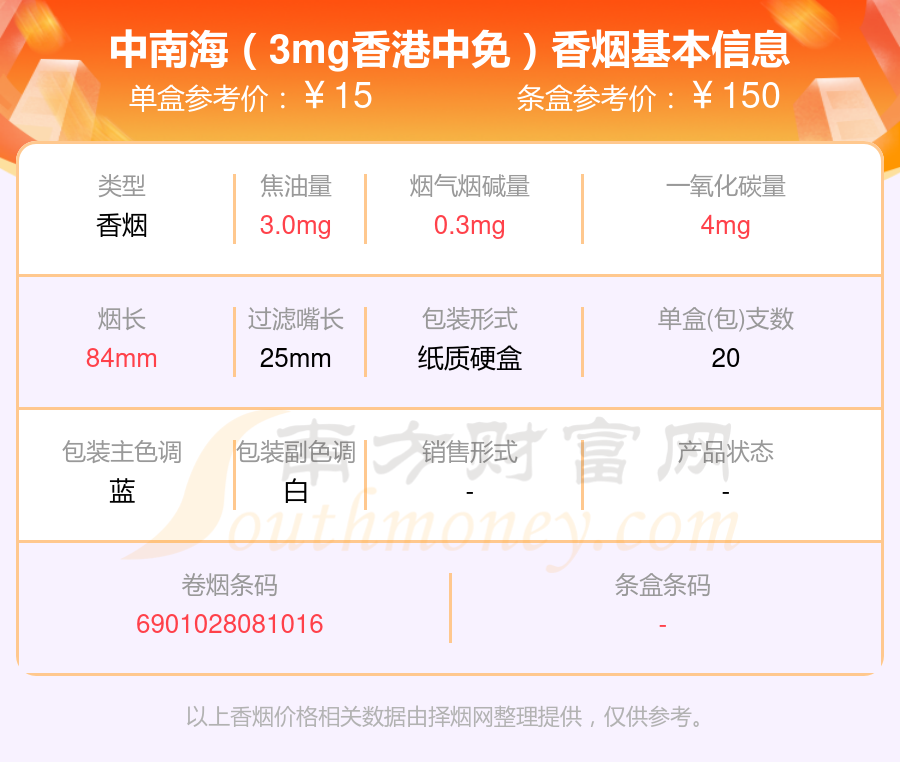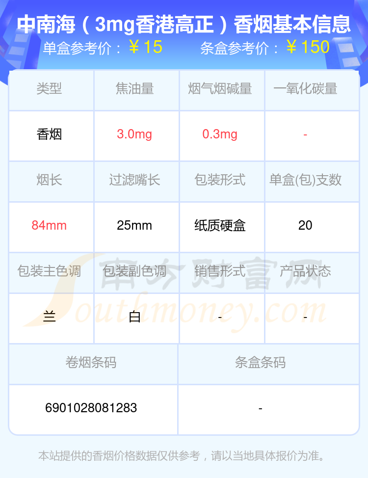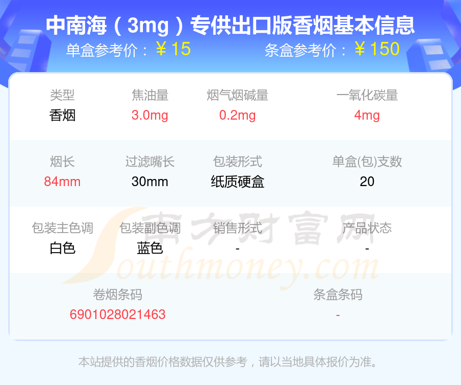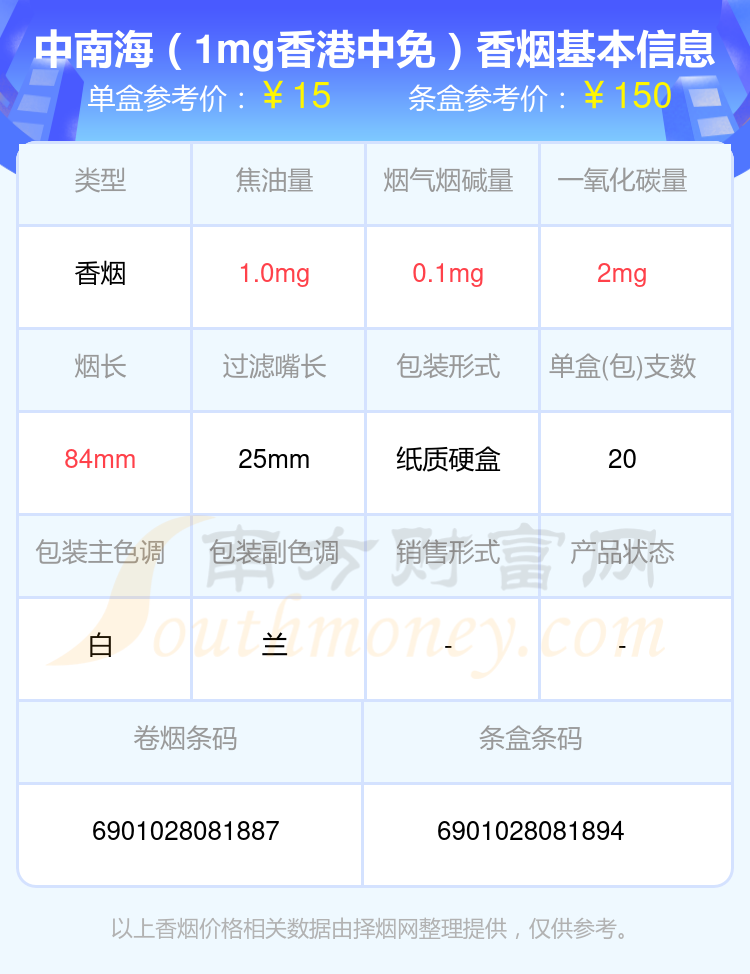 中南海(3mg香港高正)参考价15.0元/包、中南海(3mg香港中免)参考价15.0元/包、中南海(3mg)专供出口版参考价15.0元/包、中南海(3mg纳米)参考价22.0元/包、中南海(3mg香港达裕)参考价11.0元/包、中南海(3mg上海日上)参考价10.0元/包、中南海(京韵俊杰)参考价28元/包、中南海(1mg)出口版参考价20.0元/包、中南海(1mg香港兆进)参考价20.0元/包、中南海(1mg香港中免)参考价15.0元/包等。