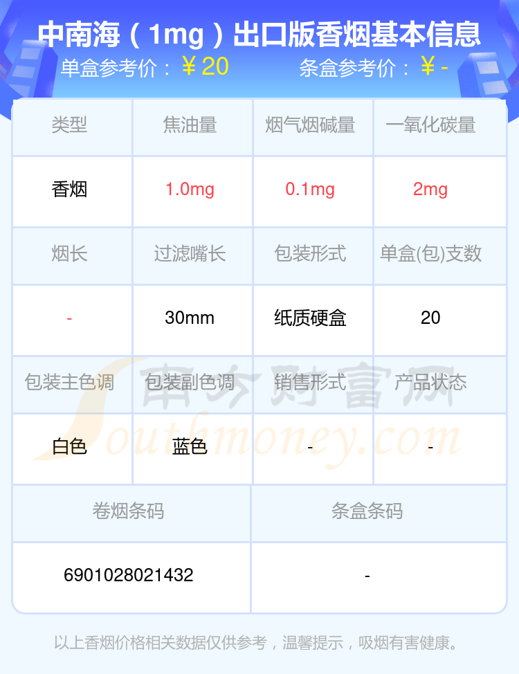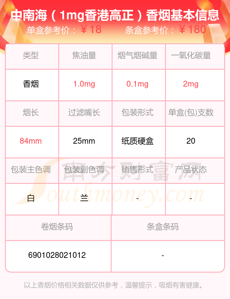 中南海香烟焦油量2mg以下的烟有中南海(1mg)出口版、中南海(1mg香港兆进)、中南海(1mg香港中免)、中南海(1mg香港高正)、中南海(1mg日本)、中南海(超1流)等,具体价格如下: