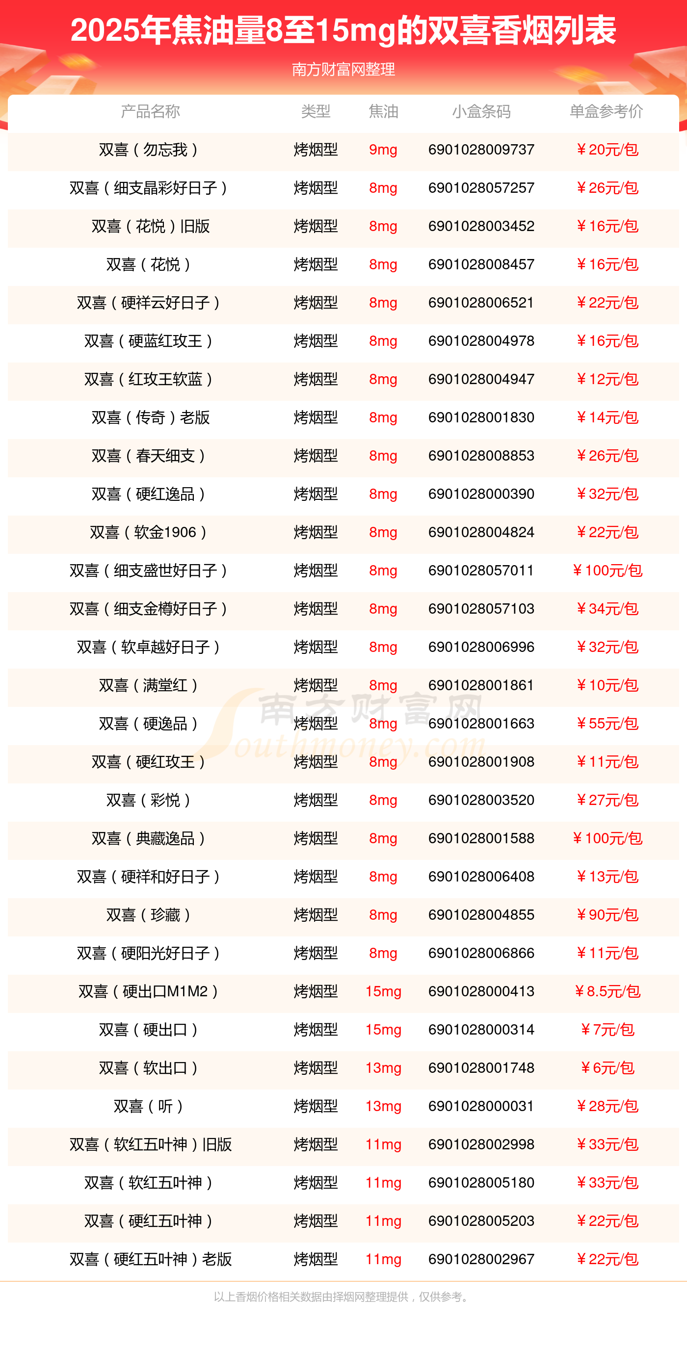 双喜香烟焦油量8至15mg的烟有双喜(勿忘我)、双喜(细支晶彩好日子)、双喜(花悦)旧版、双喜(花悦)、双喜(硬祥云好日子)、双喜(硬蓝红玫王)、双喜(红玫王软蓝)、双喜(传奇)老版、双喜(春天细支)、双喜(硬红逸品)等,详细价格如下:
